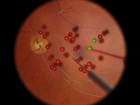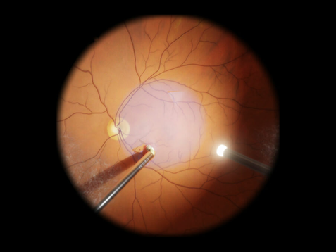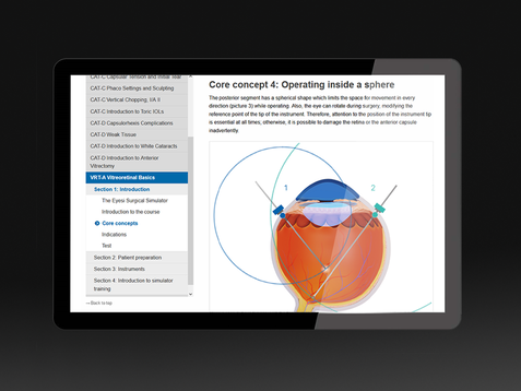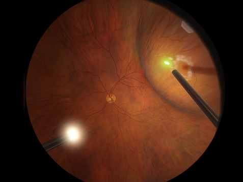 For training of posterior segment surgery, the Eyesi Surgical platform can be equipped with a vitreoretinal interface, consisting of a patient model head, instrument set, and auxiliary optics. During virtual surgery, instruments such as light probe, forceps, endolaser, or vitrector are available as well as a vitrectomy machine interface.